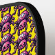 This image showcases a pixel art depiction of a spider, rendered in a charming, retro 8-bit style. The spider’s body is predominantly pink, accented with darker shades and light blue highlights, creating a striking contrast against its black outline. This pixelated arachnid exudes a playful yet edgy vibe, reminiscent of classic video game aesthetics. The charm-like design suggests symbolism related to luck and protection, while the colours pink and black add layers of mystery and complexity. The pixel art style not only evokes nostalgia but also highlights the intricate artistry involved in digital creations.