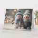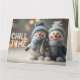 This charming and cozy winter scene features two adorable plush snowman dolls sitting on snow. They are wearing blue and gray knit hats and scarves, and the image is overlaid with the text "CHILL TIME." The soft focus background of warm bokeh lights creates a perfect atmosphere.