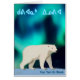 A cute polar bear (Ursus maritimus), done in a simple primitive, or naive style, walks on the polar ice, the Aurora Borealis (Northern Lights) glow brightly in the background. Inuktitut text reading "ᑯᕕᐊᓇᒃ ᐃᓄᕕᐊ" (Kuvianak Innovia - Merry Christmas), in the syllabic alphabet adopted in Nunavut, also appears in glowing blue and white.Customise by adding your own additional text.