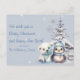 This custom holiday postcard features a cute North Pole Christmas theme. A cute baby penguin and polar bear cub are standing near a snow covered pine tree, beneath falling snowflakes. A Christmas greeting is printed on the left in an elegant script font, followed by a sample family name. You can personalise to postcard to include your own custom name or text.