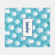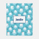 A blanket with a cute Christmas pattern featuring polar bears standing on floating ice wearing red santa hats. Little igloos, snowflakes and fish surround these adorable polar bears chilling on the water. Light blue background. Cute and whimsical holiday design. Personalised with a name.