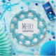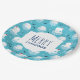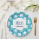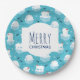 Paper plates with a cute Christmas pattern featuring polar bears standing on floating ice wearing red santa hats. Little igloos, snowflakes and fish surround these adorable polar bears chilling on the water. Light blue background. Cute and whimsical holiday design. Merry Christmas written inside a white frame layered over top.