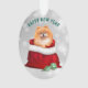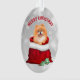 An adorable little red Pomeranian dog pops out of a red gift bag on the front of this Christmas ornament. A few teal and gold pattern Holiday tree bulbs lay just in front of the Santa bag.The text above the image says "MERRY CHRISTMAS" in red. The image and text are placed on a silver abstract bokeh background. The back of the ornament has the same image, but with the text "HAPPY NEW YEAR" in teal green.