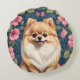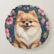 Cute Pomeranian Dog With Pink Petunias Round Cushion
