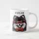 Start your day with a dash of cuteness using the Cute Pomeranian Red Nerd Glasses Custom Name Giant Coffee Mug. This oversized mug features an adorable Pomeranian in a black and white illustration, adorned with red nerd glasses and a stylish red and black buffalo plaid bow tie. Make it uniquely yours by adding a custom name, and savour your favourite beverages in this charming and personalised giant coffee mug.