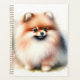 A fluffy Pomeranian dog with a vibrant orange and white coat, featuring large, expressive eyes and a cheerful expression. It stands amidst soft, pastel-coloured flowers and gentle watercolor splashes, creating a warm and inviting atmosphere. The background is light and airy, enhancing the dog's fluffy fur and playful demeanour.