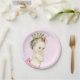 Adorable princess baby girl wearing ruffle pants and bunny slippers princess baby shower plates. These cute princess baby shower paper plates can be customised with text in the font style and colour of your choice, and you can choose your own background colour.