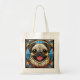 Cute Pug dog breed theme tote bags in an artsy stain glass look digital printed graphic design printed on both sides in earth tone colours created for anyone who has a pet Pug dog at home.