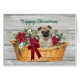 The front of this fun Holiday greeting card has a delightful image of a fawn coloured Pug dog in a wicker basket. The basket is decorated with poinsettia floral bouquets and a bright red bow. The customisable text above the image says "Happy Christmas" in green script. Everything is placed on a rustic grey wood panel background. The inside has two more text fields for you to customise as you like.