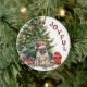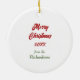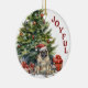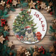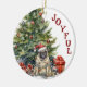 On the front of this Holiday ornament is the image of an adorable Pug Dog wearing a red and white Santa hat. The dog sits in front of a decorated Holiday tree, and is wrapped in a string of festive lights. Red text at the side says "JOYFUL". On the back, red and green text says MERRY CHRISTMAS", and there are additional text fields for you to customise. Make it say whatever you'd like!