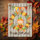 This Autumn Happy Birthday! greeting card features a cute baby dressed in a pumpkin costume sitting in a wreath of colorful fall leaves. There is also a bunting banner with acorns and a faux wooden background.