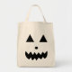 A cute Halloween tote bag featuring a happy pumpkin face.