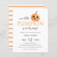 Simple and modern Halloween baby shower paper invitation featuring a cute pumpkin on a clean white background. With the words " our little pumpkin is on his way " and stripe pastel orange and white reverse. Ready for easy personalisation.