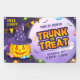 Halloween Trunk or Treat banner features a kid-friendly cute pumpkin wearing a purple hat filled with sparkly stars, white ghost, candies, bats, a colourful banner, a glowing iridescent moon, clouds and sparkly stars.