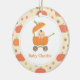 Decorate the little one's nursery room with this cute ornament that has a theme suited for autumn fall period. It features an adorable little baby who is peeping out from an orange baby carriage that is designed to look like a pumpkin! In the background is a pattern made using pumpkins and leaves. Gender neutral colour palette of orange, yellow, brown and green that is suited for both baby boys and girls. Add the child's name in text template.