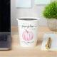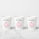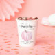 Cute paper cups for your fall baby girl shower featuring "A Sweet Little Pumpkin Is On Her Way" written in simple grey typography and stylish script with swashes, and a pastel pink pumpkin watercolor.