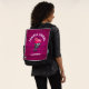 A backpack with attitude. Designed with a cute zombie girl illustration with hot pink hair and deathly green skin. Wearing punk rock themed attire. Her arms outstretched searching for brrraaaains. Curved text says: Zombie Grrrl with a personalised name beneath. Set on a background which is a deep magenta colour with a grunge look.