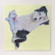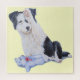 This cute border collie puppy is waving "hello" or is he just being a bit shy and hiding behind his paw? either way this little black and white pup looks very sweet with his little blue teddy bear by his paws. I think this cute little waving collie puppy jigsaw will make a great gift for someone special, or maybe you just want to treat yourself to this lovely challenging jigsaw border collie dog jigsaw for youself. The original puppy portrait painting of him and his teddy are painted in watercolour.