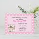 This adorable first birthday invitations for girls features a cute brown and white puppy dog with a pink background and white hearts. It can be personalised with a name and all your party details.