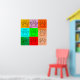 Wall art with acute pattern of black dog paw prints in squares of different colours.