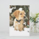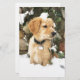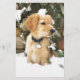 cute yellow golden retriever playing in the snow against field stone wall with ivy