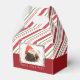 A favour box with an adorable photo of a pug puppy sleeping while wearing a santa hat. Merry Christmas is written on the band of his hat, in a trendy handwritten font. A grunge border with colourful Christmas lights surround the frame of this cute photo. The background is a festive candy cane striped pattern in red white and green. Customisable text at the bottom says: Peace Joy and Pugs.