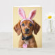 This design shows a close-up portrait of a small dog with warm russet fur, set against a smooth, soft yellow background that keeps all attention on its face. A plush pink headband sits across its head, topped with tall bunny ears that give it a sweet, dress-up look 🐰. The dog’s large, dark eyes shine with a gentle curiosity, like it’s leaning in to share a quiet, friendly moment. Fine fur details catch the light, creating a soft glow along the cheeks and muzzle. Around its neck is a slim dark collar with a small round pink tag that adds a tender accent without stealing focus. Near the top, simple Easter text appears in a light color, centered and easy to read, with a smaller line placed beneath it in a slightly darker shade. The lighting stays soft and warm, and the pink ears stand upright against the pale yellow background with a little 🌷.