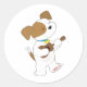 A cute puppy with tail wagging, is singing and dancing, while strumming a ukulele.