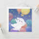 A cute fluffy white puppy with colorful balloons in night sky filled with stars