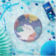 A cute fluffy white puppy with colorful balloons in night sky filled with stars