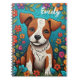 Personalised notebook. Adorable whimsical ai art with a brown and white puppy dog surrounded by folk art flowers in pink, orange and purple.