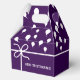Custom dark purple favour boxes. White ribbons and party balloons design. Edit name to personalised.