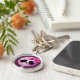 This adorable purple sugar skull is decorated with tribal swirls and drops with a large heart in the middle of the forehead. A single pink rose sits on the side of the round skull just above the large black eyes. Violet flower pedals surround the eyes and the mouth has stitches that make their way up the side of the cheek. The skull sits on top of a deep purple background creating a beautiful contrast. This keychain design is a lovable example of this Day of the Dead symbol.