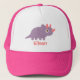 A cute hat for that has a cartoon of a purple triceratops dinosaur with big round eyes, and pink horns on its head. Great for who love the prehistoric or Jurassic themes! Personalise with s name.