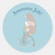A cute encouragement sticker with a touch of whimsy, which says Awesome Job! Perfect for teachers to reward their students good work. This whimsical illustration shows a long-eared white bunny, wearing yellow pants, sitting on the handlebars of a old fashioned vintage bicycle (big front wheel and small back wheel). The bike is pedalled by a big brown bear with white spots on his back. Adorable and cute.