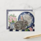 A unique still life featuring a grey bunny rabbit, rose flowers in a blue bunny vase and an antique Dedham rabbit plate, all rendered in blue, white, pink and natural shades. Originally painted with acrylics on canvas. A cute card for "just a note", that will be perfect for anyone who loves rabbits and Dedham pottery. Whimsical, original artwork & design by Tuzi Williams.