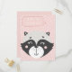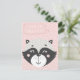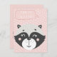 NewParkLane - Kids Birthday Invitation Postcard, with a cute black, white and grey racoon in watercolor, with a pink text balloon with a "You're invited', against a fun blush background with little white hearts.