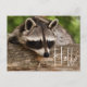A postcard with a photograph of a cute and curious racoon resting his face on a wooden log. Adorable.