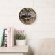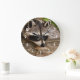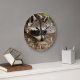 A clock with a photograph of a cute and curious racoon resting his face on a wooden log. Adorable.