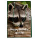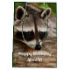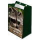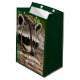 A gift bag with a photograph of a cute and curious racoon resting his face on a wooden log. Adorable.