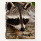 Spiral notebook with a photograph of a cute and curious racoon resting his face on a wooden log. Adorable.