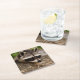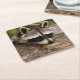 Paper coasters with a photograph of a cute and curious racoon resting his face on a wooden log. Adorable.