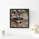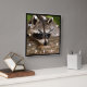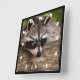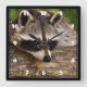 A clock with a photograph of a cute and curious racoon resting his face on a wooden log. Adorable.
