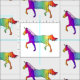 Cute Rainbow Unicorn Pattern Girly Fabric. Cute unicorn in rainbow colours on white background. Hand drawn unicorn with colourful stripes.