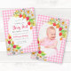 A cute watercolor raspberry Berry First Birthday themed invitation. You can add a photo to the back of the invitation.