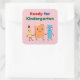 Shows a smiling cartoon pencil, book, and ruler, holding hands, and "Ready for Kindergarten". Cute and colourful. Change the background colour!