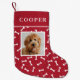 Give your favorite furry friend their very own Christmas stocking this holiday season. Personalize the dog Christmas stocking by adding your dog's name and photo with a pattern of white bones and snow against a dark red background.