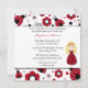 This 5.25x5.25 birthday party invite has a ladybug theme. The top and bottom border has black and red lady bugs with flowers and polkadots. There is a girl with blonde hair wearing a polkadot dress next to your easily customisable party information.