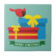 Cute Red Cardinal Opening A Blue Gift Ceramic Tile