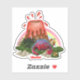 A beautiful cartoon illustration of an extinct red and blue dinosaur lying down amongst flowers and rocks in front of an island volcano that is erupting behind him. A rainbow appears above the volcano and a text template for your personalised wording appears below the dinosaur. Ideal for boys theme party favours.
